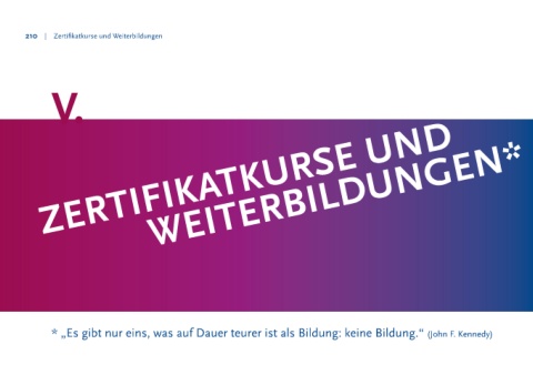210 | Zertifikatkurse und Weiterbildungen V. ZERTIFIKATKURSE UND WEITERBILDUNGEN* * „Es gibt nur eins, was auf Dauer teurer ist als Bildung: keine Bildung.“ (John F. Kennedy)